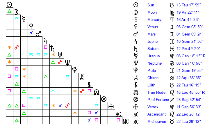 | Sun | 13 Taurus 18 | 14 Taurus 29 | 7 Virgo 21 |