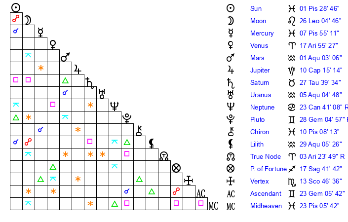 | Mercury | 7 Pisces 55 | 11 Pisces 29 | 3 Cancer 40 |