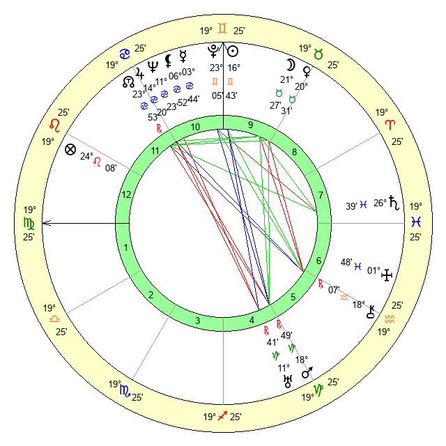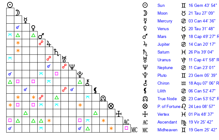 | Sun | 16 Gemini 44 | 18 Gemini 9 | 10 Libra 19 |