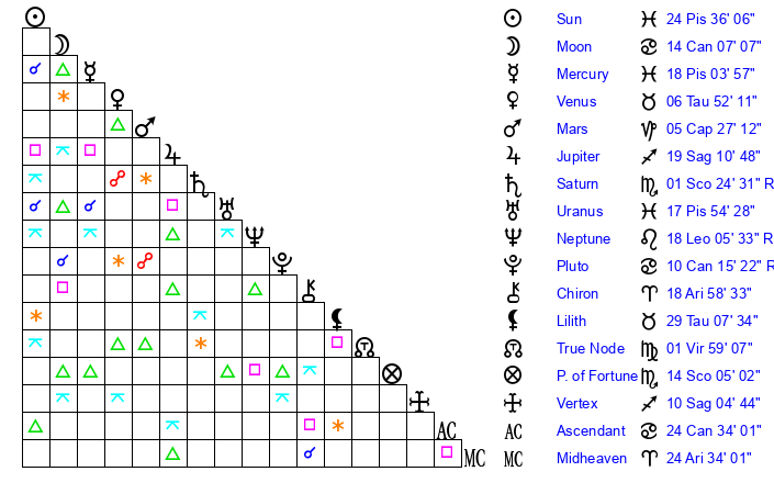 Sun | 24 Pisces 36 | 25 Pisces 7 | 2 Cancer 37 |