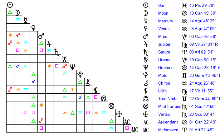 | Sun | 10 Pisces 29 | 11 Pisces 22 | 3 Cancer 27 |
