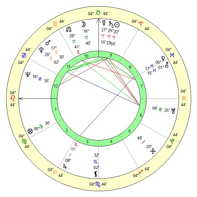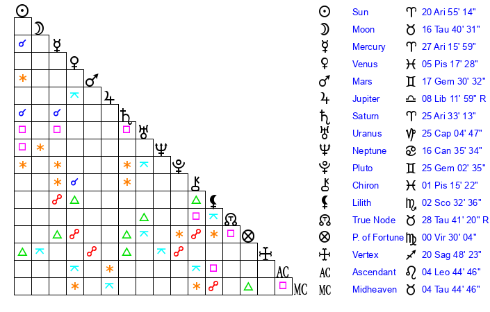 | Sun | 20 Aries 55 | 22 Aries 3 | 11 Leo 24 |