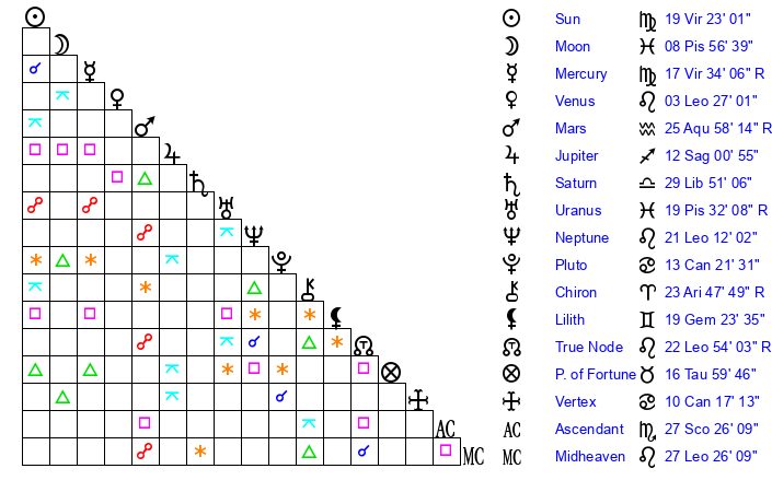 Mercury | 17 Virgo 34 | 19 Virgo 3 | 11 Capricorn 11 |