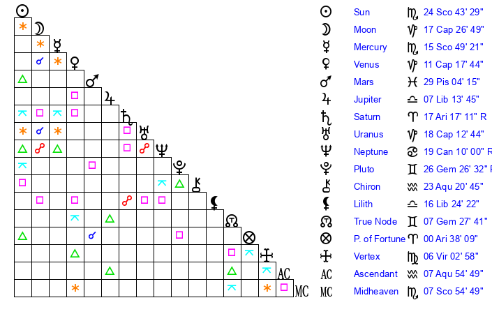 | Sun | 24 Scorpio 43 | 25 Scorpio 50 | 21 Pisces 15 |