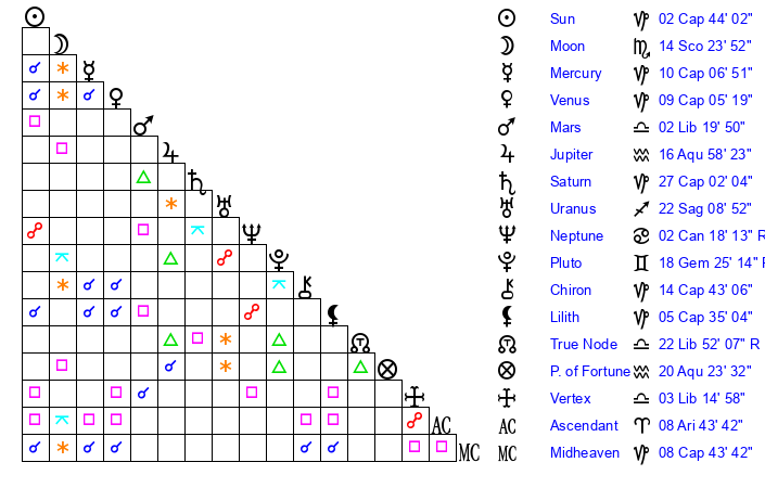 | Saturn | 27 Capricorn 29 | 14 Pisces 0 | 9 Aquarius 19 |