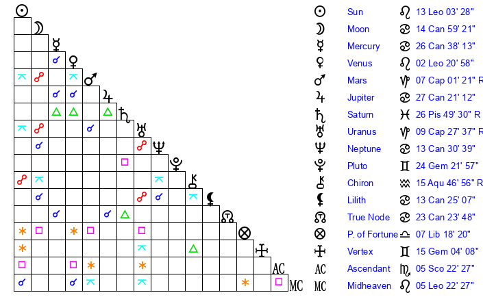 | Mercury | 26 Cancer 38 | 5 Leo 21 | 19 Scorpio 13 |