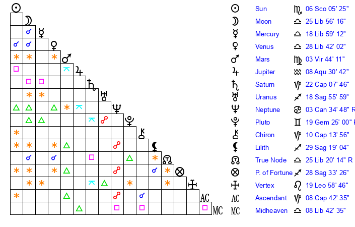 | Mercury | 18 Libra 59 | 0 Sagittarius 59 | 13 Aquarius 51 |