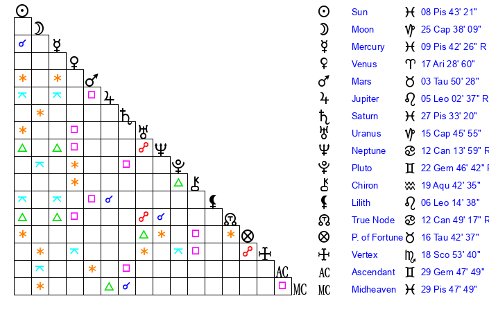 | Sun | 8 Pisces 44 | 10 Pisces 21 | 2 Cancer 44 |