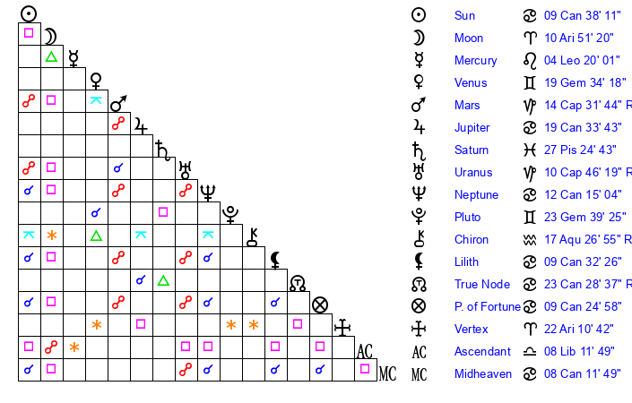 | Sun | 9 Cancer 38 | 11 Cancer 4 | 4 Scorpio 8 |