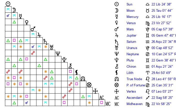 | Moon | 25 Taurus 5 | 26 Leo 9 | 17 Libra 39 |
