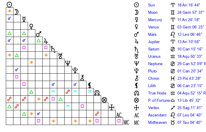 | Moon | 24 Gemini 56 | 28 Leo 36 | 23 Gemini 39 |
