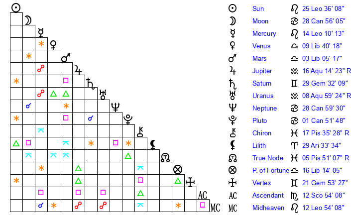 | Sun | 25 Leo 36 | 26 Leo 43 | 15 Sagittarius 31 |