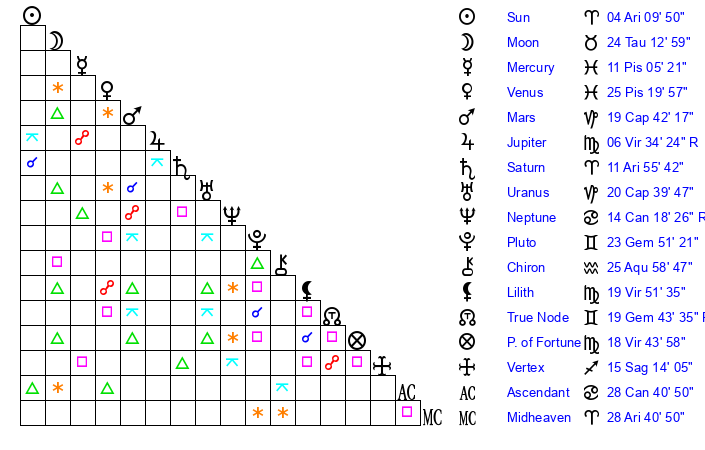 | Sun | 4 Aries 10 | 5 Aries 3 | 26 Cancer 6 |
