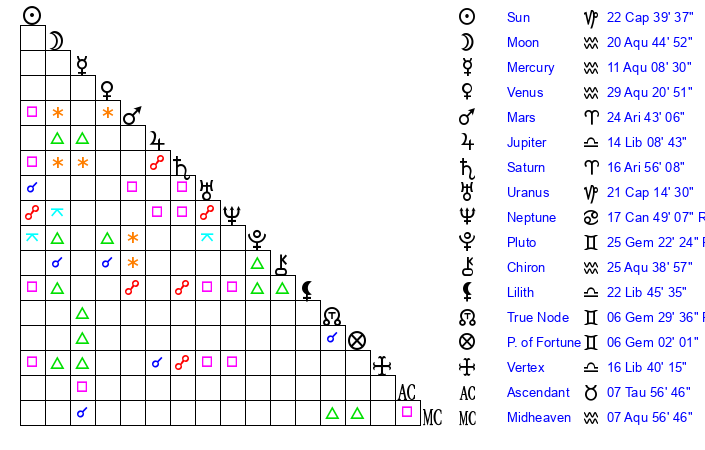 | Moon | 20 Aquarius 42 | 20 Cancer 55 | 9 Taurus 48 |