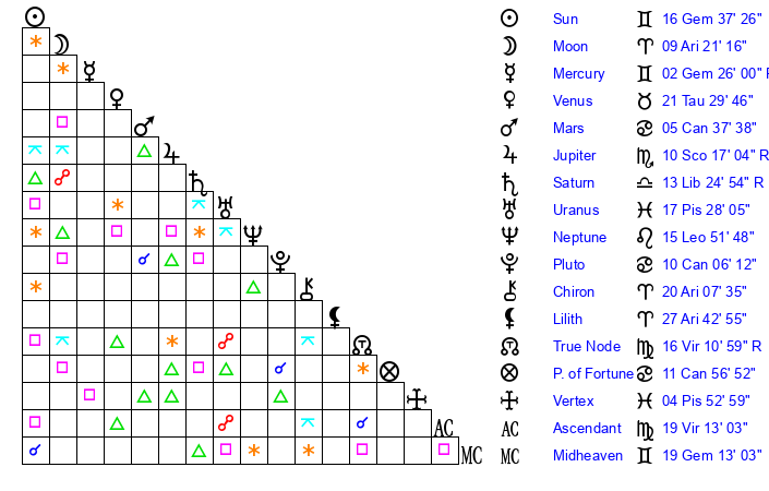 Sun | 16 Gemini 37 | 17 Gemini 55 | 24 Virgo 30 |