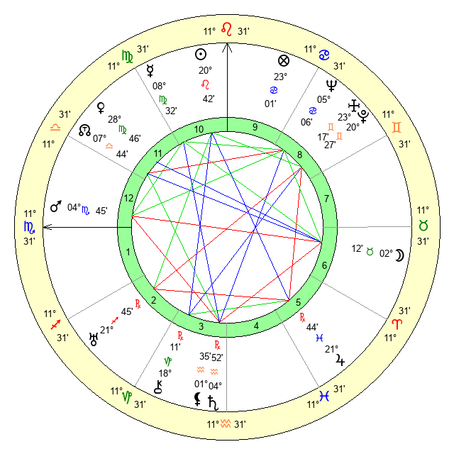 | Venus | 28 Virgo 46 | 16 Cancer 59 | 5 Scorpio 34 |