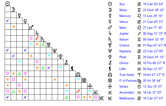 | Venus | 21 Cancer 46 | 8 Gemini 58 | 11 Sagittarius 2 |