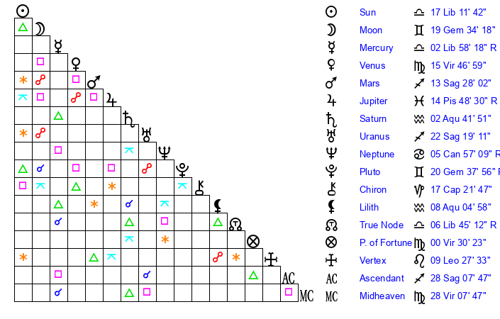 | Moon | 19 Gemini 27 | 21 Gemini 40 | 17 Sagittarius 19 |