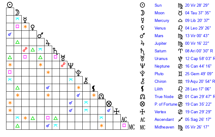 | Sun | 20 Virgo 29 | 21 Virgo 9 | 17 Capricorn 49 |