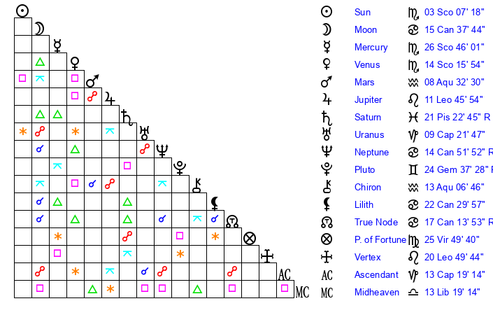 | Mercury | 26 Scorpio 46 | 28 Scorpio 9 | 14 Pisces 29 |