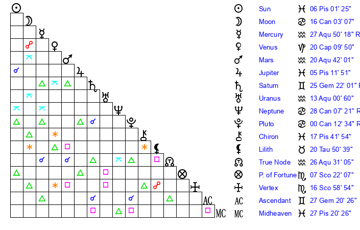 | Moon | 16 Cancer 0 | 6 Aquarius 26 | 25 Cancer 55 |
