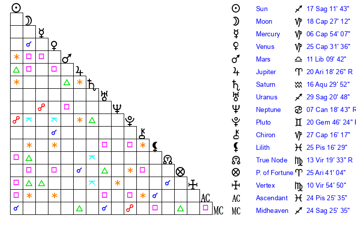 | Sun | 17 Sagittarius 12 | 18 Sagittarius 5 | 18 Aries 9 |