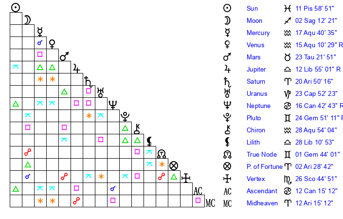 | Sun | 11 Pisces 59 | 13 Pisces 6 | 3 Cancer 56 |