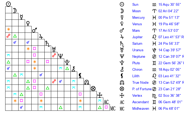 | Sun | 15 Aquarius 31 | 17 Aquarius 9 | 10 Gemini 46 |