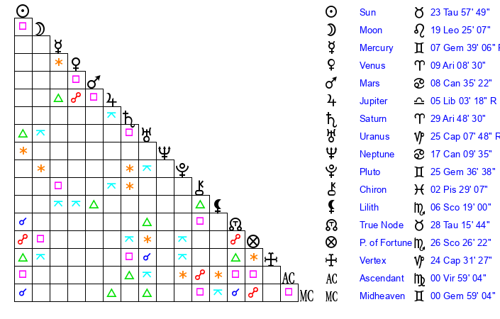 | Moon | 19 Leo 34 | 28 Sagittarius 30 | 29 Libra 20 |