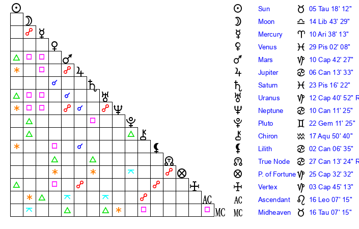 | Moon | 14 Libra 42 | 21 Aries 2 | 17 Aquarius 21 |