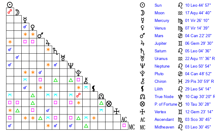 | Neptune | 4 Leo 51 | 1 Aries 56 | 7 Leo 5 |
