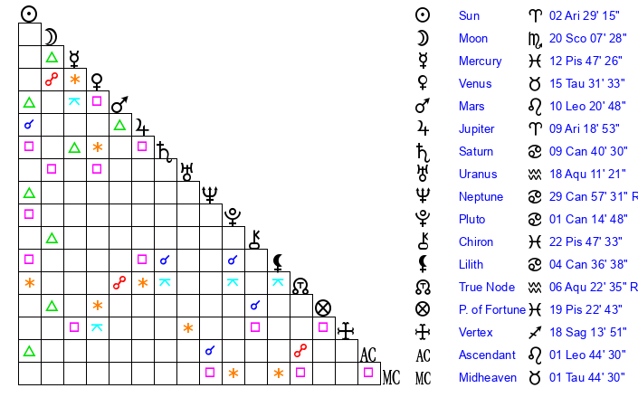 | Moon | 20 Scorpio 6 | 14 Capricorn 19 | 12 Scorpio 20 |