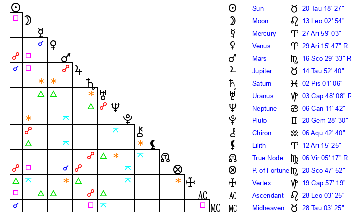 | Moon | 13 Leo 6 | 10 Scorpio 19 | 17 Capricorn 1 |