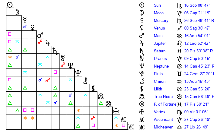 | Mercury | 26 Scorpio 49 | 9 Sagittarius 13 | 3 Pisces 47 |