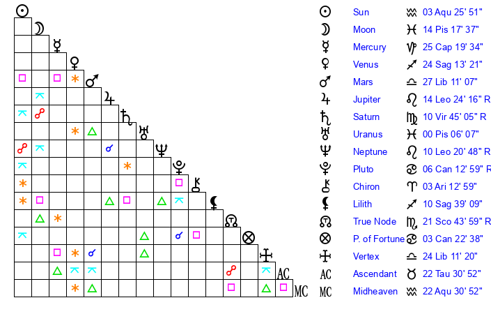 Sun | 3 Aquarius 25 | 4 Aquarius 58 | 17 Taurus 46 |