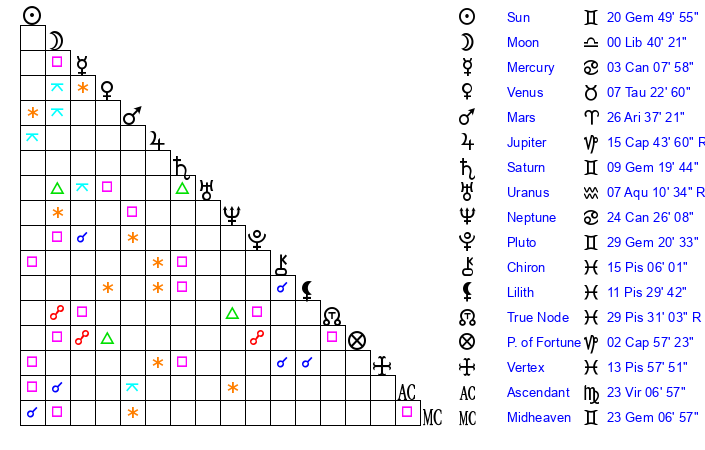 | Sun | 20 Gemini 50 | 21 Gemini 43 | 8 Libra 37 |