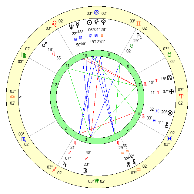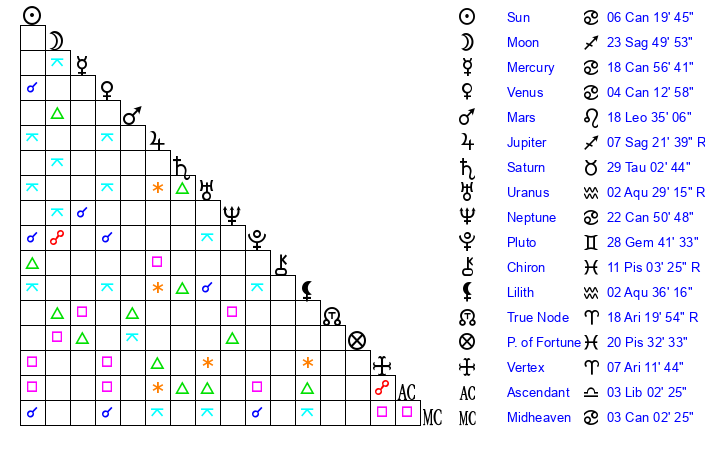 | Moon | 23 Sagittarius 43 | 16 Leo 15 | 10 Aquarius 35 |
