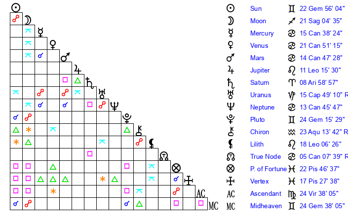 | Sun | 22 Gemini 56 | 23 Gemini 38 | 15 Libra 44 |
