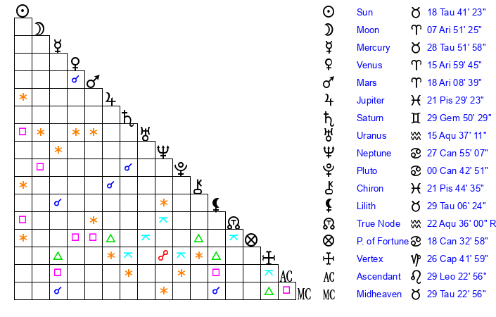 | Moon | 7 Aries 44 | 25 Libra 19 | 17 Aries 18 |