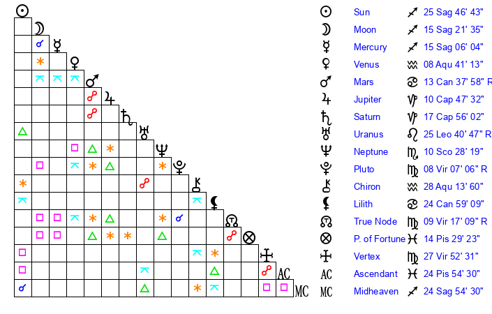 | Moon | 15 Sagittarius 17 | 26 Cancer 16 | 29 Aries 14 |