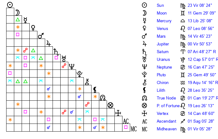 | Jupiter | 0 Virgo 40 | 20 Cancer 28 | 14 Virgo 3 |