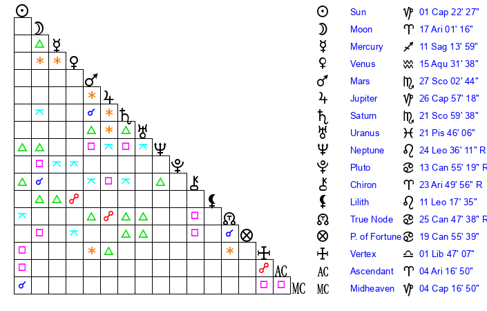 | Moon | 17 Aries 1 | 10 Libra 44 | 19 Scorpio 39 |