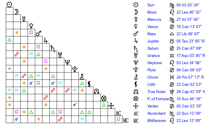 | Moon | 22 Leo 47 | 25 Libra 50 | 18 Leo 57 |