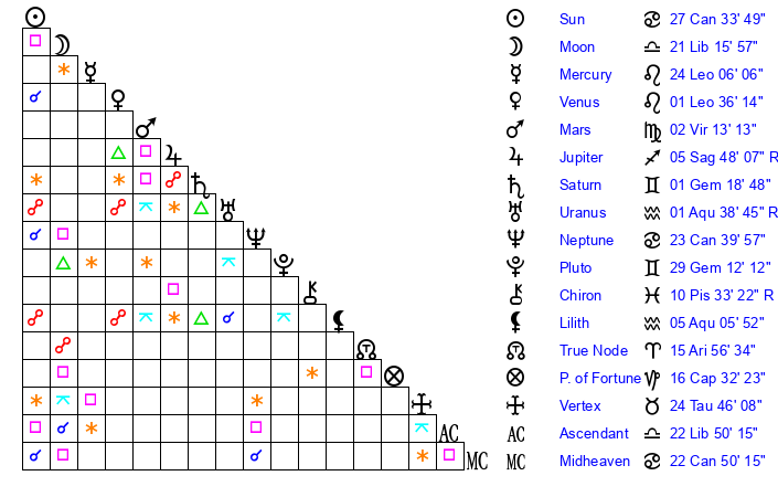 | Sun | 27 Cancer 34 | 28 Cancer 14 | 17 Scorpio 57 |