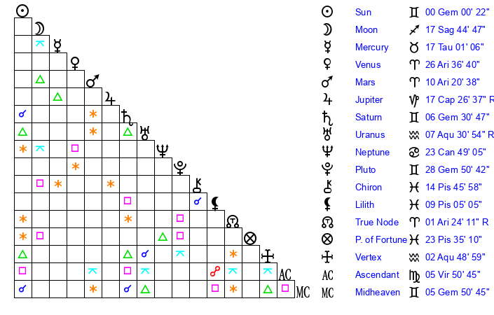 | Sun | 0 Gemini 0 | 0 Gemini 53 | 17 Virgo 21 |