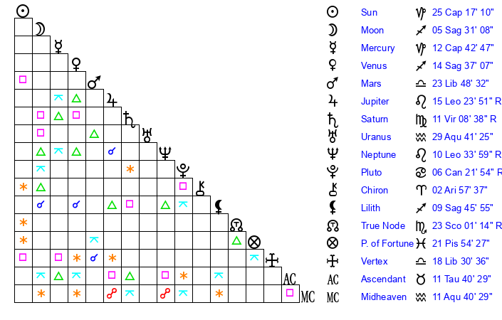 Moon | 5 Sagittarius 28 | 0 Virgo 4 | 12 Libra 57 |