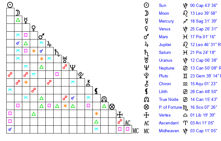 | Sun | 0 Capricorn 44 | 2 Capricorn 22 | 28 Aries 15 |