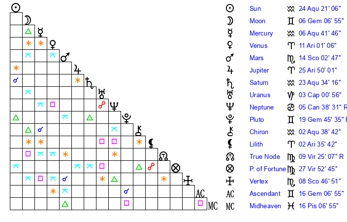 | Sun | 24 Aquarius 21 | 25 Aquarius 15 | 21 Gemini 58 |