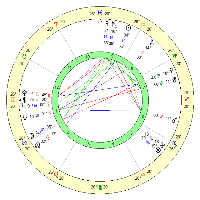 | Sun | 4 Pisces 57 | 6 Pisces 20 | 0 Cancer 6 |