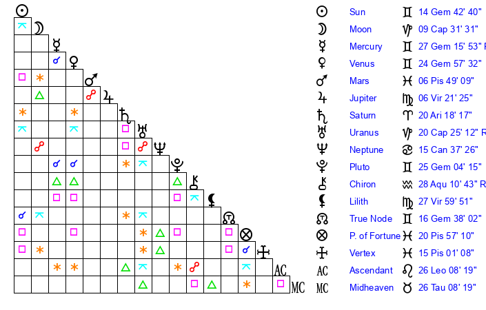 | Sun | 14 Gemini 43 | 15 Gemini 38 | 6 Libra 16 |